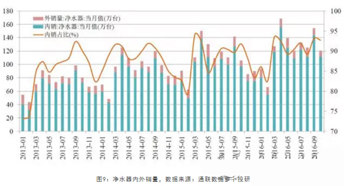2016年净水器月销量同比增长都在10%以上,上半年销售额相比去年同期增长近20%;国内净水器销量以内销为主,2016年内销量对总销量增长贡献明显。
