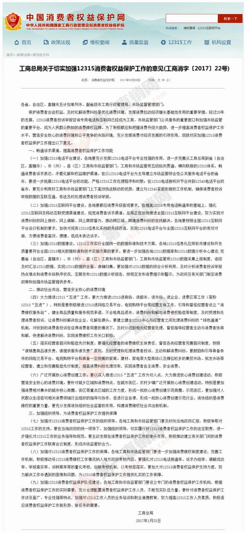 据报道,国家工商总局近日印发关于切实加强12315消费者权益保护工作的意见,要求各地工商和市场监管部门畅通诉求渠道、提高消费者权益保护工作效能,推动社会共治、营造安全放心的消费环境,加强组织领导、为消费者权益保护工作提供保障。