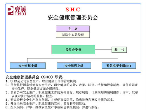 完美公司在稳健发展过程中,十分重视安全生产,积极探索适合企业长远发展的创新型安全管理模式,采取了一系列管理措施,不断夯实安全生产根基,始终把安全生产作为一切工作不可逾越的底线严抓。自2006年SHC成立以来,一直积极贯彻落实国家和地方的安全生产法律、法规,确保公司安全生产管理走向制度化、规范化、常态化,同时采用审核、培训、紧急应变于一体的绩效管理模式,通过隐患排查、安全例会等工作,对公司安全生产进行查漏补缺、总结评估,真正把安全生产工作落到实处。