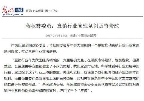 一年一度的全国两会正如火如荼开展,委员们的提案内容也成了媒体关注的热点。日前,中共中央主管主办、中央宣传部代管的中央党报、中国四大报之一的光明日报旗下的光明网发布了一条资讯:蒋秋霞委员:直销行业管理条例亟待修改。