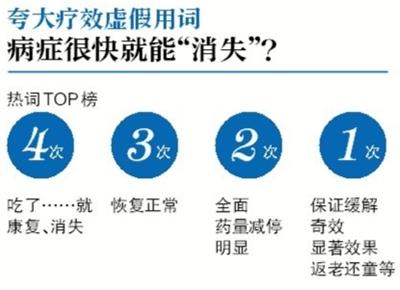 解读:关于疗效的提法共有23种表述方式,其中“康复”、“消失”、 “吃了……就”等词较为常见,比如“很多慢性病全面改善,病情全面康复”、“胃痛、口腔溃疡,马上吃马上见效,无论何种便秘,上午吃了下午就通”等, 率往往高达95%以上,甚至100%。