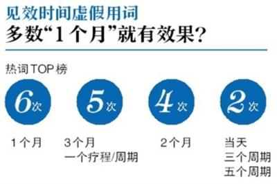 解读:在梳理中新京报记者发现,所有虚假广告会提到具体的见效时间,短则当日,慢则两年,共有23种提法。按提及次数排名,前三名为“1个月见效”、 “三个月见效”和“一个疗程/周期见效”、 “两个月见效”,提及次数分别为6次、5次、4次。