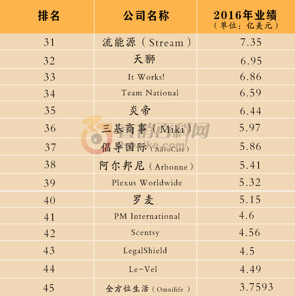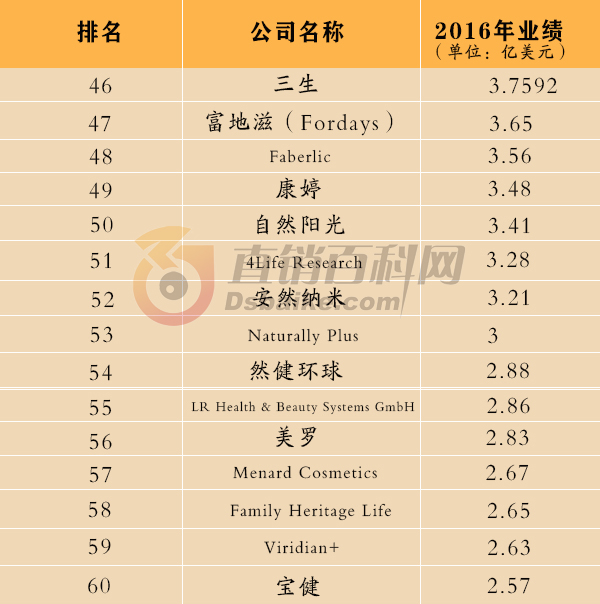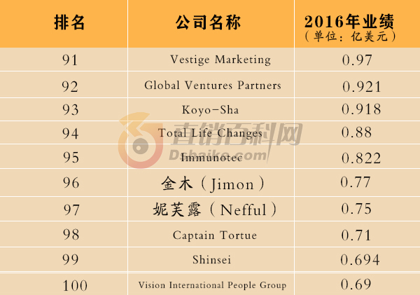 2017年4月20日,美国直销新闻网站DSN公布了2016年全球直销企业100强。2016年的全球直销百强企业来自17个国家,总收入超过820亿美元(约5643亿人民币)。