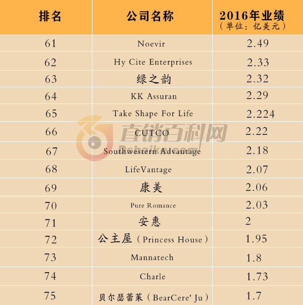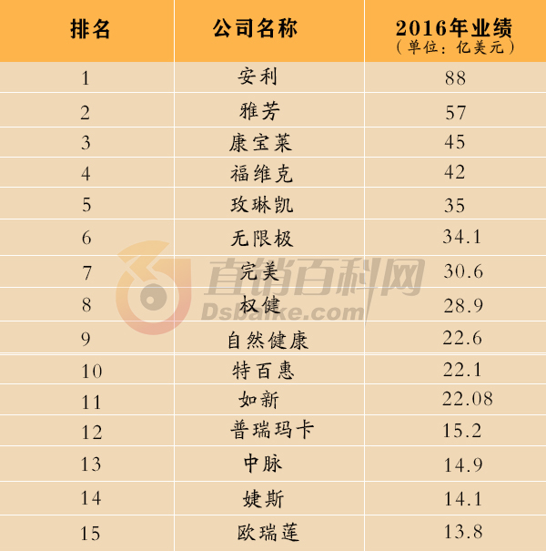 2016年,全球许多直销公司达到了新的里程碑。其中,有10家公司分别增长了1亿美元,有22家公司年收入达10亿美元以上。安利2016年全球收入为88亿美元,连续五年蝉联全球直销冠军。雅芳、康宝莱、福维克和玫琳凯在今年的榜单中排名前五。