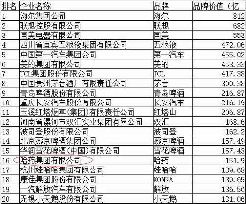 哈药集团是一家老牌药企,是全国医药行业中的首家上市公司;在2009年中国最有价值品牌排行榜上,哈药集团是唯一一家进入前20名的药企,品牌价值达151.9亿元人民币,并成功跻身亚洲品牌500强行列。