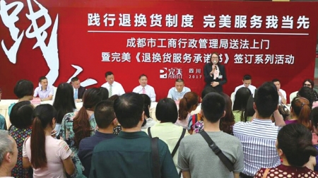为树立企业良好形象,提高服务质量,规范市场秩序,保护消费者合法权益。9日下午,一场以“践行退换货制度 完美服务我当家”为主题的成都市工商行政管理局“送法上门”暨完美《退换货服务承诺书》签订系列活动在成都举行。