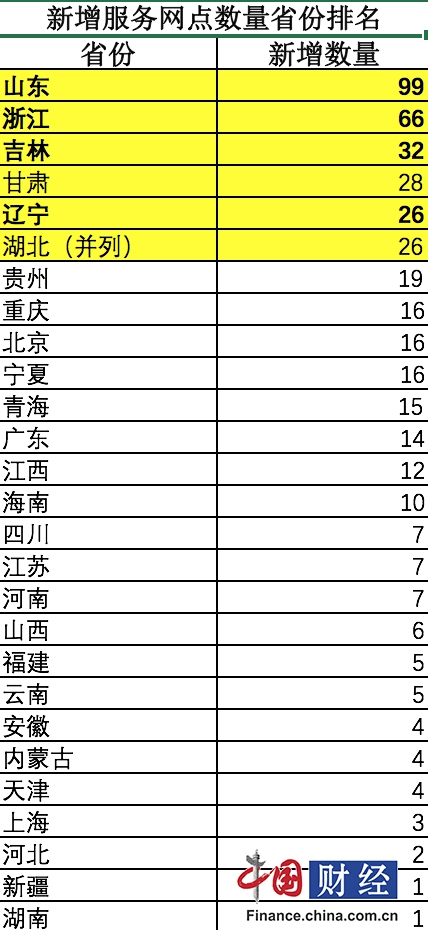 从直销区域扩大的省份排名来看,无论是新增分支机构数量还是新增服务网点数量,吉林省、山东省、辽宁省、浙江省等4省份均位列前5名。