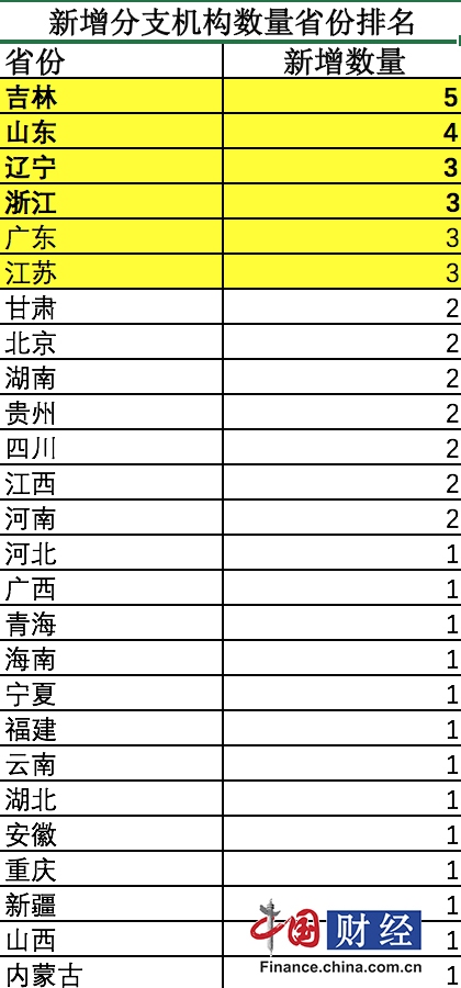 从新增分支机构数量省份排名来看,除吉林省(5家)以外,其余4名均为东部沿海省份,依次为山东省(4家)、辽宁省(3家)、浙江省(3家)、广东省(3家)、江苏省(3家)。