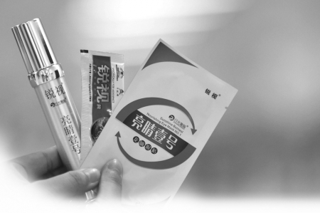 花了近万元,黄婆婆买到360袋冲剂、36片贴片、6瓶喷雾,装了满满一购物车。拖着车子回到家,她才有机会查看自己到底买了什么:3样产品上均有“锐视”商标,产品名称分别为“亮眼壹号龙脑眼贴”、“缓解视疲劳颗粒”和“亮眼壹号喷雾”。