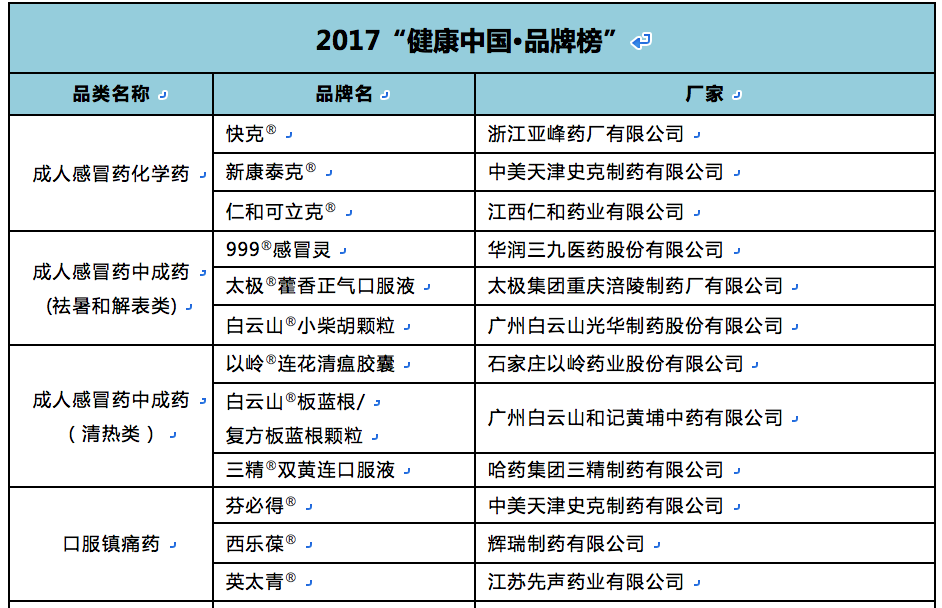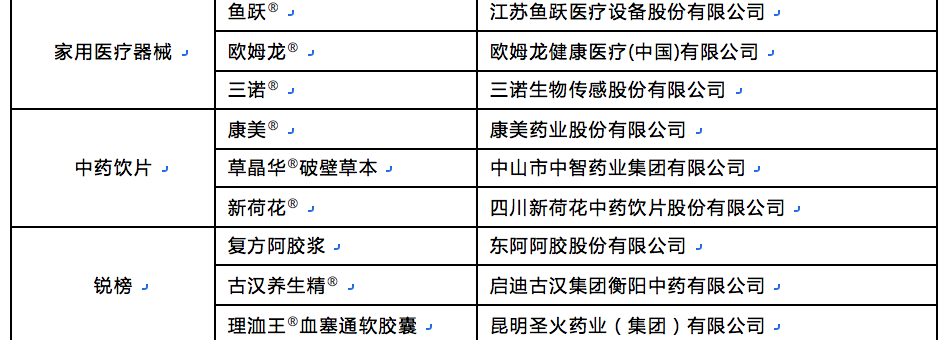 此外,复方阿胶浆、古汉养生精®、理洫王®血塞通软胶囊等12个药品品牌,也因良好的成长性和临床评价,进入2017“健康中国•品牌榜”锐榜。