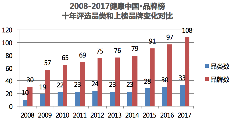 从2008年的10个评选品类30个获奖品牌到2017年的32个评选品类108个获奖品牌,“健康中国•品牌榜”经历了从OTC品类到OTC加常见慢性病用药品类,从单纯药品品牌到药品加家用医疗器械和中药饮片的发展历程,在顶层战略的指引和消费升级的大趋势下,未来“健康中国•品牌榜”上榜品类的细分还将继续!