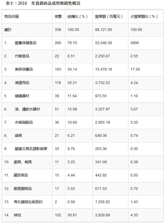 对照2015年调查资料,销售商品种类家数的结构比并无不同,但若以营业额来看,则销售「其他商品」的营业额首次进入前3大销售商品类别,营养保健食品、美容保养品、清洁用品及其他商品的结构比虽然都是增加0.16%~2.26,然营业额较前一年下降的仅有清洁用品,营养保健食品、美容保养品以及其他商品依序增加约55.64亿元(成长率11.97%)、7.32亿元(成长率4.96%)及3.31亿元(成长9.46%)。