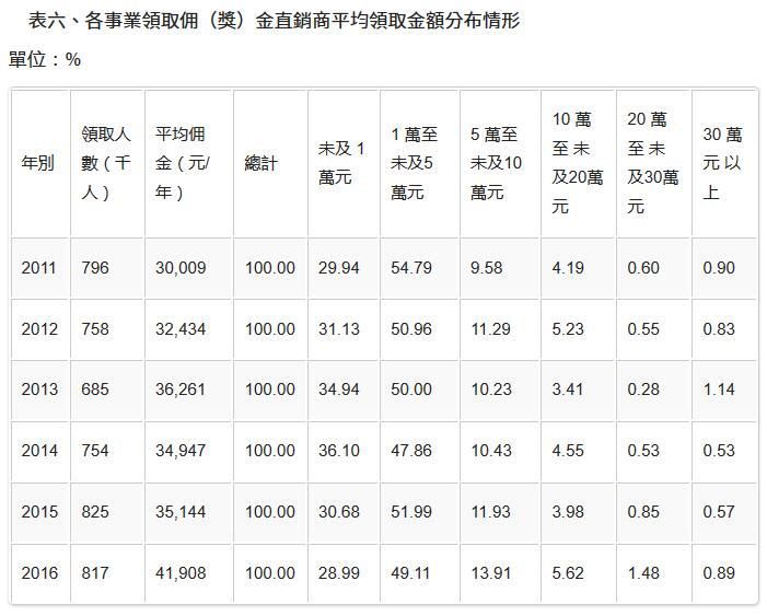 曾领取佣(奖)金的直销商约81.7万人,占直销商总数29.56%,平均每人全年获得佣(奖)金41,907元,较2015年的35,144元,增加6,763元,而比起2011年,6年来,直销商的平均年收入增加了1万元左右。