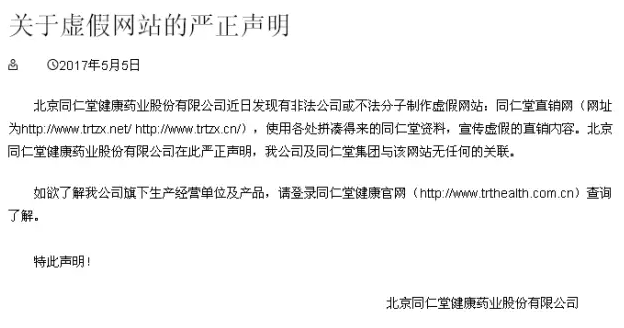 记者就网络上的相关信息咨询了客服,对方明确表示:“目前我们的直销部门还没成立官网,网上的信息参差不齐,有需要可以直接向我们咨询,会有相关负责人为您解答。”记者也在北京同仁堂健康药业股份有限公司的官网上看到了今年5月“关于虚假网站的严正声明”,声明中提到“近日发现有非法公司或不法分子制作虚假网站:同仁堂直销网(网址为http://www.trtzx.net/ http://www.trtzx.cn/),使用各处拼凑得来的同仁堂资料,宣传虚假的直销内容。”