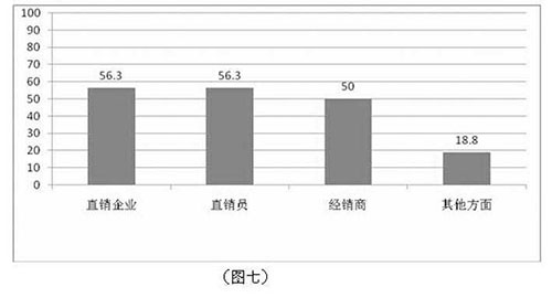 直销企业认为出现上述问题的内部原因主要在于直销企业内部管理弱化,直销员和经销商法律意识不强;外部原因则在于现行的法律法规比较滞后。为减少各类违法违规行为,直销企业认为,工商和市场监管部门应重点加强对直销企业、直销员及经销商的监管,三个环节所占百分比分别为56.3%、56.3%、50%,具体比例如(图七)所示。