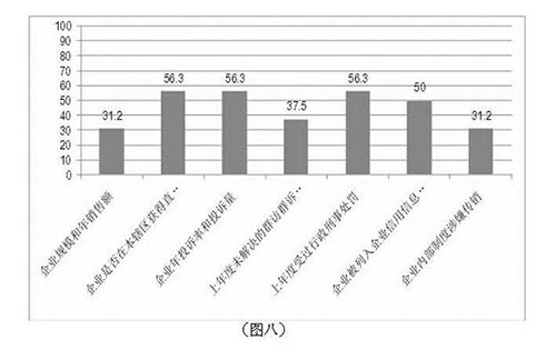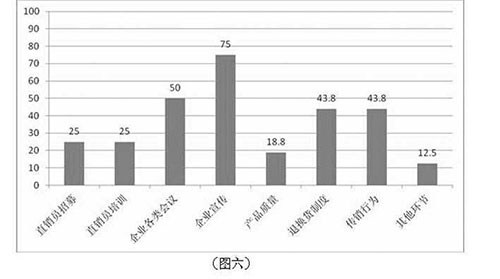 直销企业易出现问题的主要环节排在前两位的是企业宣传、企业各类会议,所占比例分别为75%、50%,排在第三位的是退换货制度及企业的传销行为,所占比例均为43.8%,与监管部门调查问卷的结果相吻合。具体比例如(图六)所示。