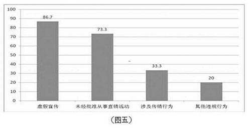 通过调查,直销企业在经营中易出现违法违规的问题,主要集中在虚假宣传、未经批准从事直销活动和涉及传销三个方面,违法行为发生率分别为86.7%、73.3%和33.3%,与监管部门调查问卷的结果高度吻合。具体比例如(图五)所示。
