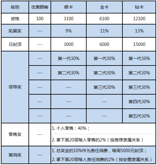 首先是“拓展奖”,也称“层奖”。银卡会员每碰一层可得9%的利润(银卡会员拓展奖每天3000元封顶),金卡会员每碰一层可得11%的利润(金卡会员拓展奖每天6000元封顶),而钻卡会员每碰一层可得13%的利润(钻卡会员拓展奖每天15000元封顶)。