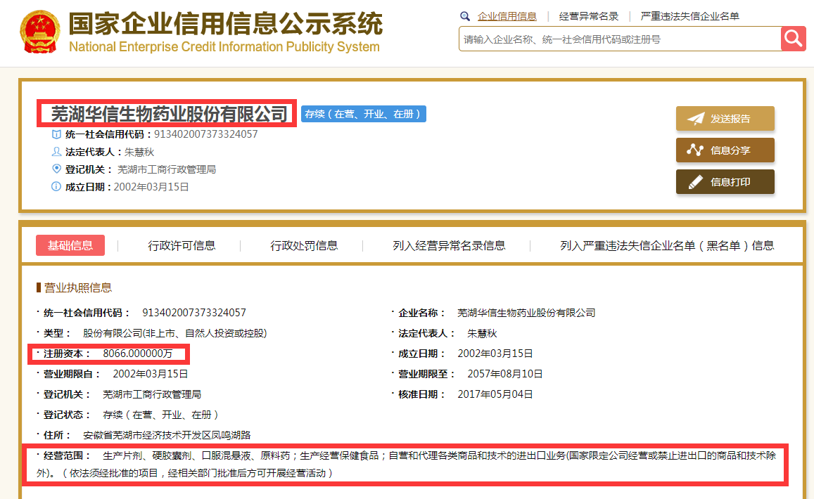 记者通过国家企业信用信息公示系统查询到,芜湖华信生物药业股份有限公司成立于2002年,由朱慧秋担任董事长,杨思林担任公司董事兼总经理,注册资金8066万元。