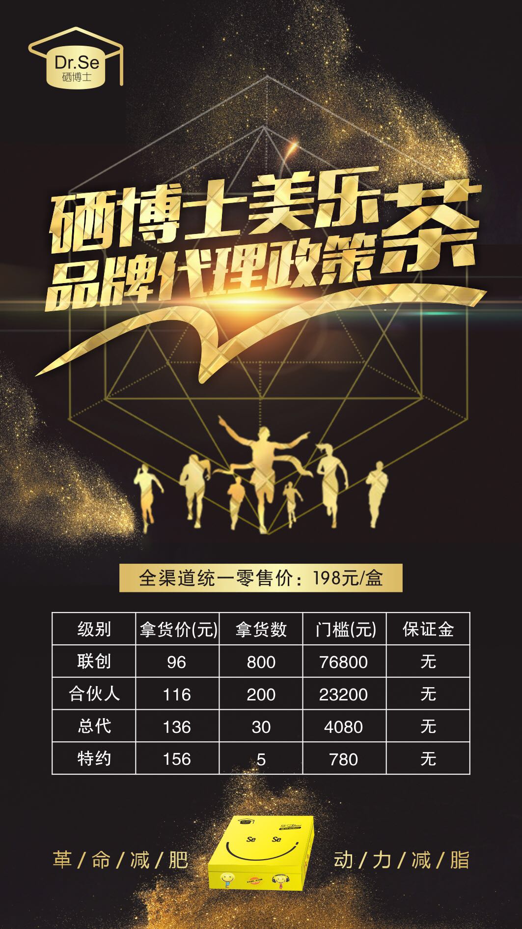 据招商会分享人陈先生介绍,华信药业目前在微商板块的主要产品是硒博士美乐茶,其代理等级共有4级,分别是特约代理、总代、合伙人和联创代理,而成为代理的门槛是消费780元成为特约代理;消费4080元成为总代;消费23200元成为合伙人;消费76800元成为联创代理人。根据等级的不同,拿货的政策也有差异,特约代理的拿货价是156元/盒,5盒起订;总代的拿货价是136元/盒,30盒起订;合伙人的拿货价是116元/盒,起订数是200盒;而联创代理的拿货价是96元/盒,起订数是800盒。