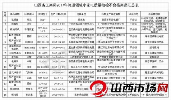 山西省工商局2017年度流通领域小家电质量抽检不合格商品汇总表