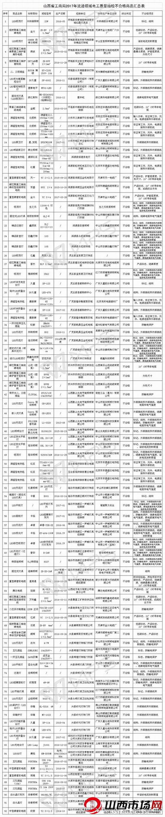 山西省工商局2017年流通领域电工质量抽检不合格商品汇总表