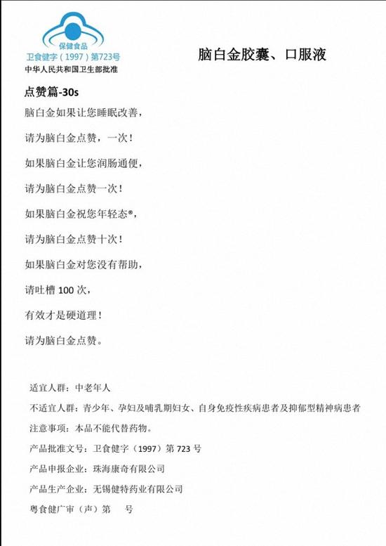 脑白金胶囊、口服液最新送审的广告词