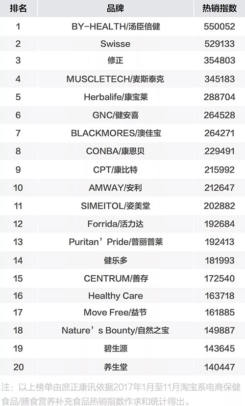 近日,2017营养健康电商热销品牌排行榜出炉,该榜单由庶正康讯依据2017年1月至11月淘宝系电商(含淘宝网和天猫商城)保健食品/膳食营养补充食品热销指数统计得出。以下为大家列出「2017营养健康电商热销品牌TOP20」——