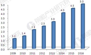 2009-2016年中国养老产业市场规模(单位:万亿元)