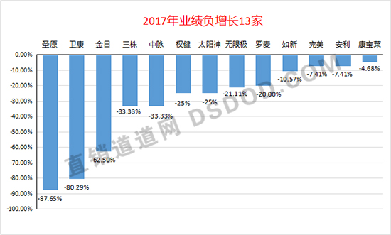 2017年,拿牌直销企业中有13家出现了负增长,相比2016年的12家有所增加。在这13家业绩下降的企业中,外资企业为7家,包括无限极、安利、完美、康宝莱、如新、太阳神以及金日;6家内资企业则分别为:权健、中脉、罗麦、卫康、圣原和三株。