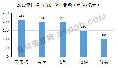继2015年和2016年后,无限极在2017年再度荣登“业绩冠军”宝座,但213亿元的业绩,与2016年的270亿元和2015年的283亿元相比,已有一定幅度的下滑。2016年屈居第二的完美在2017年取得了200亿元的业绩,与安利并列第二,权健和尚赫则分别以150亿元和100亿分列第四和第五。