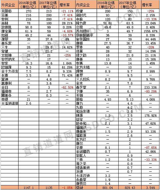 从内外资企业2017年总业绩来看,受无限极、安利、完美等传统老牌外资企业业绩持续下滑影响,2017年外资企业总业绩为1135亿元,较2016年业绩下滑1.05%;至于内资企业,2017年总业绩达829.43亿元,较2016年业绩增长3.54%。