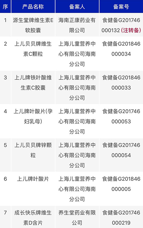 海南获准7款新品,备案人包括海南正康、上海儿童营养中心有限公司海南分公司、养生堂。
