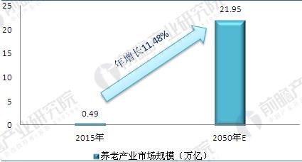 据国家社科基金《养老消费与养老产业发展研究》课题组测算,2015年中国老年市场规模达1.87万亿元,其中养老产业规模达4900亿元;到2050年中国老年市场规模将达48.52万亿元,养老产业规模将达21.95万亿元,预计老年市场和养老产业分别将以9.74%和11.48%的年增长率高速发展。