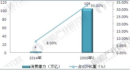 根据前瞻产业研究院发布的《养老产业发展前景与投资战略规划分析报告》预测,2014年至2050年间,老年人口消费潜力将从4万亿元左右增长到106万亿元左右,占GDP比重将从8%左右增长到33%左右。