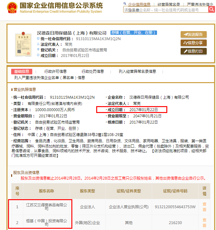 直销道道网登陆国家企业信用信息公示系统,显示汉德森公司成立于2017年01月22日,由江苏艾兰得营养品有限公司和恒基(中国)投资有限公司共同出资建立,注册资本:10000万人民币,法定代表人为常亮。