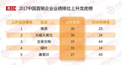 通过昨日发布的《2017年度中国直销90强业绩排行榜》(表1)的上升位次一列可以看到,排名前十位企业基本没有变化,36家企业实现了位次上升,表现突出的有表9中的5家企业。