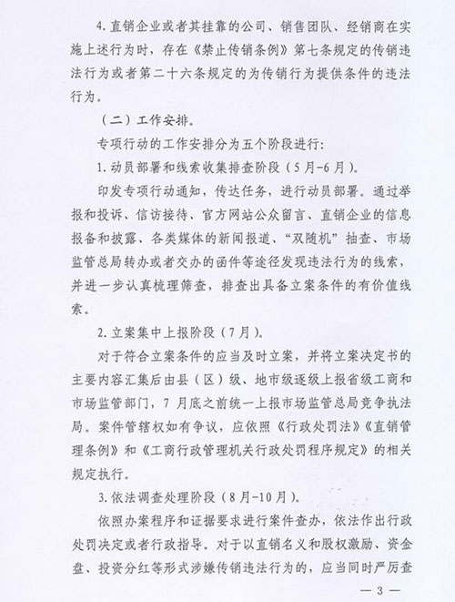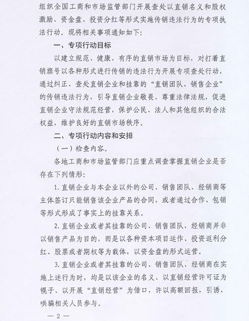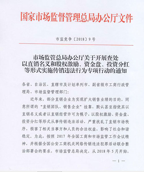 2018年4月24日,市场监管总局办公厅发布了关于开展查处以直销名义和股权激励、资金盘、投资分红等形式实施传销违法行为专项行动的通知。