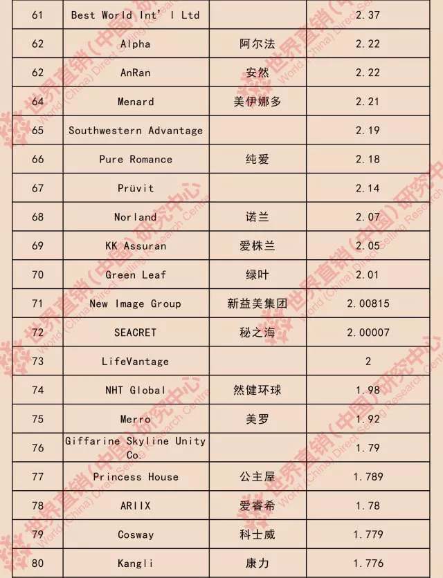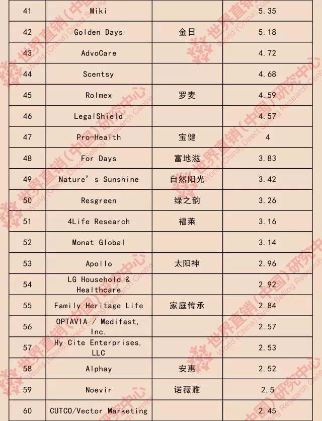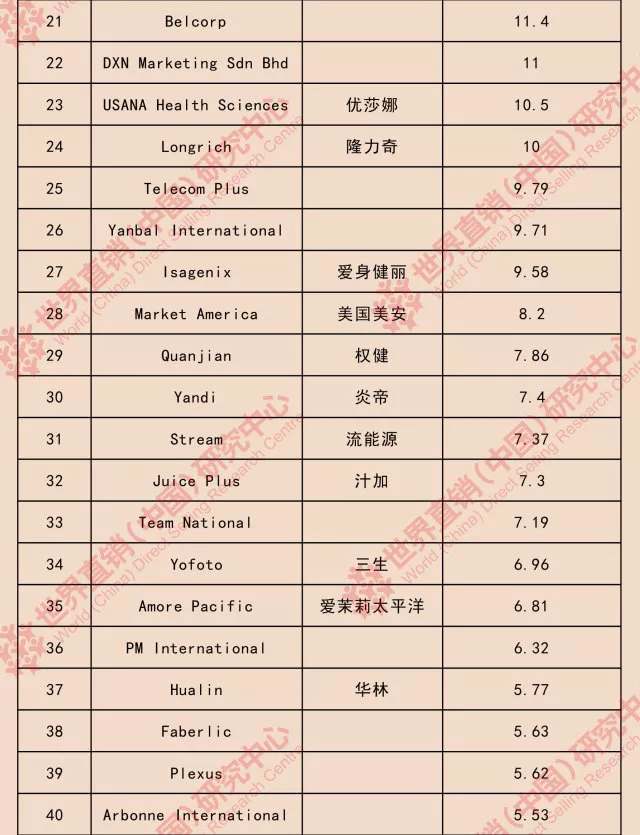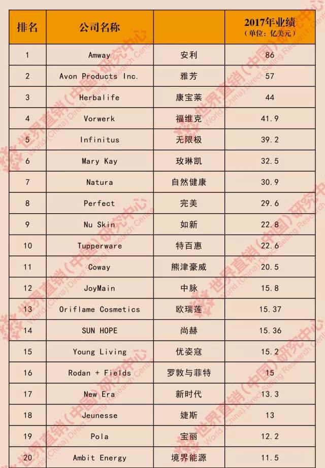 特别说明:通过梳理该榜单数据,颜值君发现,其中一些以中国为最主要市场的直销企业的业绩数据与实际情况可能存在较大的争议,一些在中国市场业绩突出的直销企业并没有进入该榜单。但它山之石可以攻玉,海外媒体的这份榜单统计了多家国外直销企业的业绩状况,这有助于我们了解海外直销企业发展。而且不同媒体数据榜单的相互借鉴,也有利于我们了解一个更真实的全球直销业。