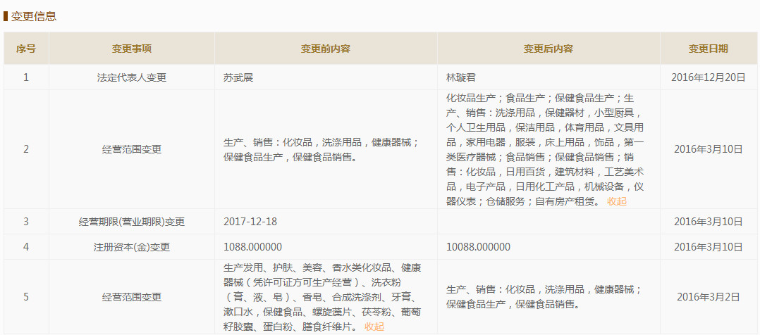 股东和法定代表人变为苏武展(现已变更为林璇君),随后,注册资本由原来的1088万元增至10088万元(实缴10088万元),达到申请直销牌照标准。同时,经营范围扩展至保健食品生产与销售。