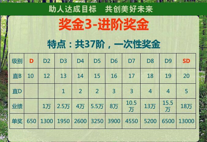 按照美乐家的规定,37个阶衔的会员可以分别享受相应阶衔的直接推荐奖(包括新推顾客卓越奖、超值套装奖金、顾客续订奖金、营销员工提成四种)、组织收入奖、晋阶奖金、培育奖金、车马津贴、分红等多种奖金。