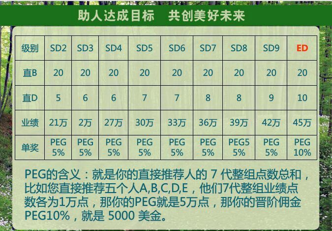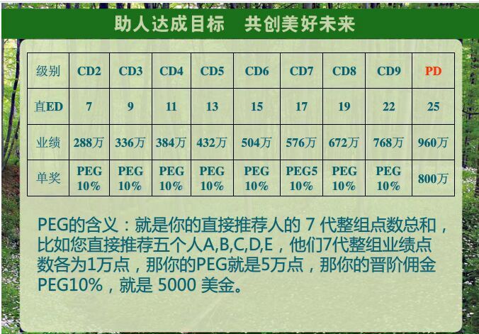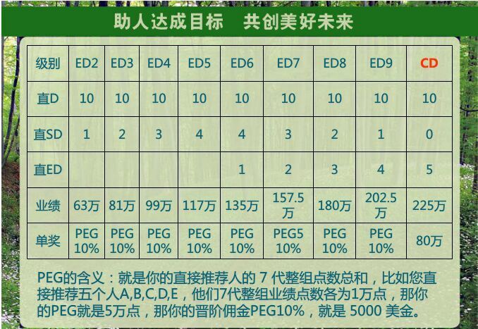 事实上,美乐家宽五深七的矩阵制度,内容颇为复杂,从基础阶D到高阶PD,共37个阶衔,其中包括D、SD、ED、CD、PD五大阶衔。登顶PD之前,从D到PD每阶又分为9个小的级别,以从D晋升为SD为例,中间需要经过D2至D9的8层晋升。当D级会员直推20个新会员,其中包括亲推的5个D级会员,并且团队营业额达到18万时,可以晋升为SD级别。