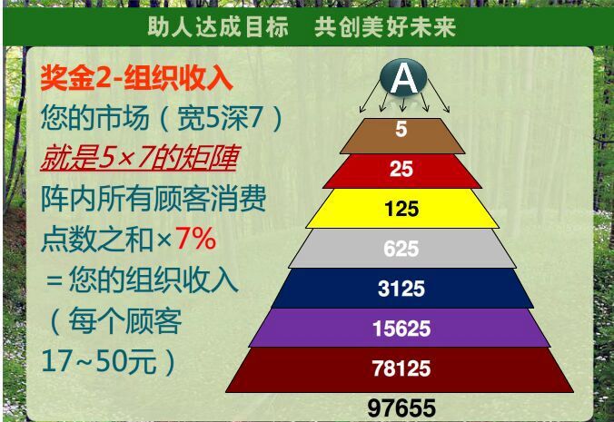 据道道舆情监控室了解,美乐家采用的奖金制度是矩阵制这一典型多层次计酬制度,这个制度基于美乐家全球通用的网络计酬制度,以方便美乐家在中国的业绩汇入全球结算体系。在宽五深七的矩阵内,根据各自等级的不同,每名美乐家经销商可以从推荐入会的消费者身上获得17~50元的组织收入。