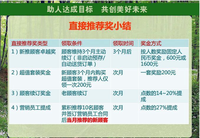 对于这些奖金,美乐家方面也做出了部分附属规定。比如,车马津贴仅限SD级别以上的会员领取,分红奖金仅由ED级别以上的会员领取,培育奖金主要由D级别以上和SD级别以上的会员领取。会员级别越高,所获奖金越高,亲推新会员级别越高,推荐人所获奖金也越高,但是,会员和推荐会员的级别必须相应提升,如果连续两个月未晋级,或被推荐会员赶超,奖金便大打折扣。