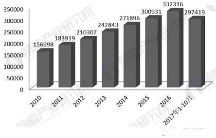 2017年1-10月份,社会消费品零售总额297419亿元。