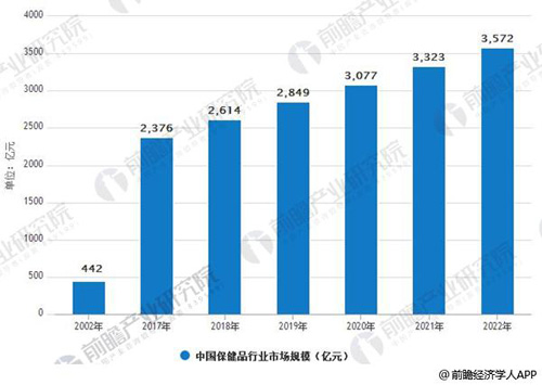 受益于经济水平提高、人口老龄化和健康意识的增强,保健品行业在我国迅速发展。据前瞻产业研究院发布的《保健品行业市场前瞻与投资规划分析报告》数据显示,我国保健品行业规模从2002年的442亿元增长至2017年的2376亿元,年均复合增速超过10%。预计到2018年中国保健品市场规模将达到2,614亿元,未来五年(2018-2022)年均复合增长率约为8.12%,2022年将达到3,572亿元。