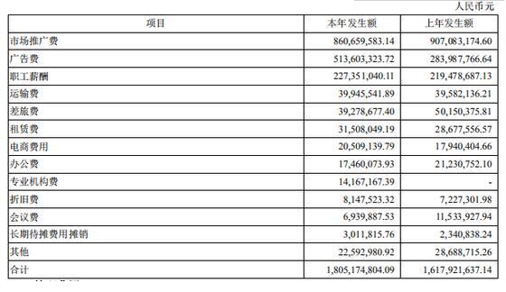 而销售费用的逐年增加,主要还是品牌宣传费用的增加,从销售费用的具体构成来看,市场推广费和广告费两项为主要的支出项,以2017年为例,其总计18.05亿的销售费用中,有8.61亿为市场推广费,有5.14亿为广告费,仅这两项占总销售费用的比重就超过了七成。