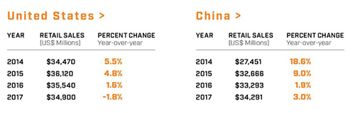 北美地区2017年直销销售额下降了1.6%。尽管2017年美国市场的销售额为349亿美元,但美国市场的表现却与上年同期持平,3年年复合增长率为0.4%。加拿大的销售额接近20亿美元,3年年复合增长率为5%。