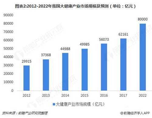 随着经济和技术的发展,加上现代生活水平的提高,人们越来越重视健康问题,我国大健康行业的规模也在不断的扩大。2017年我国大健康产业市场规模达到62161亿元,根据国务院印发布的《关于促进健康服务业发展的若干意见》,明确提出到2020年,健康服务业总规模达到8万亿元以上。