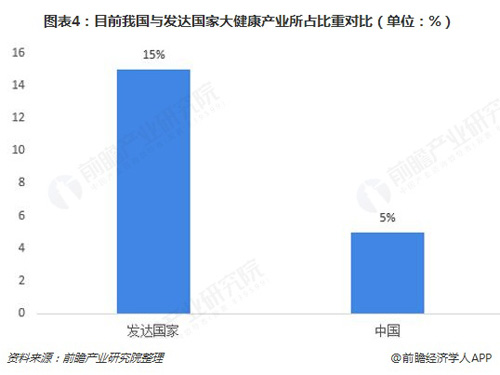 图表4:目前我国与发达国家大健康产业所占比重对比(单位:%)